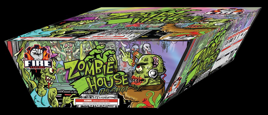 Awake the dead with this spine-tingling zipper of multi-colored crackling pearls. Giant mines with comet tails erupt into a purple strobing frenzy followed by more crazy zombie colored crackling pearls. Escape the Zombie House with a volley of blue and red strobes with two sets of colored mines and screaming whistles. Finally, set the Zombie House ablaze with white mines and golden brocade crackle. A long duration zipper that’ll give you goosebumps.